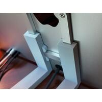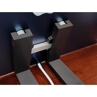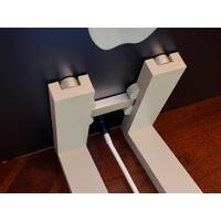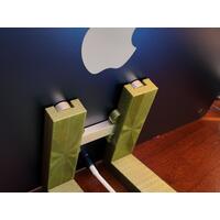 At desk level, this stand shown in the images is a support holder designed for the Apple Studio Display VESA version. It consists of two vertical arms with inner grooves that attach to a horizontal base at a 17.5° angle, sitting flush with your desk. The arms are seamlessly connected to the base, each constructed as one sturdy piece. The base itself has two extensions to provide stability and prevent tipping. Each part is made of industrial plastic that has a sheen and sharp edges, contributing to a sleek and minimalist aesthetic. This is not the basic plastic commonly found; it is specifically stronger PETG. This makes it more environmentally friendly as it's recyclable. The stand mount is designed to complement the modern design of the device it is holding, an Apple Studio Display.