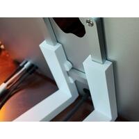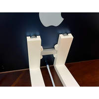 At desk level, this stand shown in the images is a support holder designed for the IMac VESA version. It consists of two vertical arms with inner grooves that attach to a horizontal base at a 17.5° angle, sitting flush with your desk. The arms are seamlessly connected to the base, each constructed as one sturdy piece. The base itself has two extensions to provide stability and prevent tipping. Each part is made of industrial plastic that has a sheen and sharp edges, contributing to a sleek and minimalist aesthetic. This is not the basic plastic commonly found; it is specifically stronger PETG. This makes it more environmentally friendly as it's recyclable. The stand mount is designed to complement the modern design of the device it is holding, an iMac.