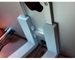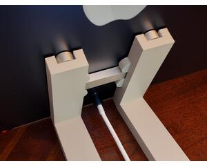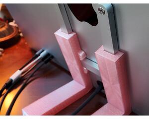 At desk level, this stand shown in the images is a support holder designed for the IMac VESA version. It consists of two vertical arms with inner grooves that attach to a horizontal base at a 17.5° angle, sitting flush with your desk. The arms are seamlessly connected to the base, each constructed as one sturdy piece. The base itself has two extensions to provide stability and prevent tipping. Each part is made of industrial plastic that has a sheen and sharp edges, contributing to a sleek and minimalist aesthetic. This is not the basic plastic commonly found; it is specifically stronger PETG. This makes it more environmentally friendly as it's recyclable. The stand mount is designed to complement the modern design of the device it is holding, an iMac.
